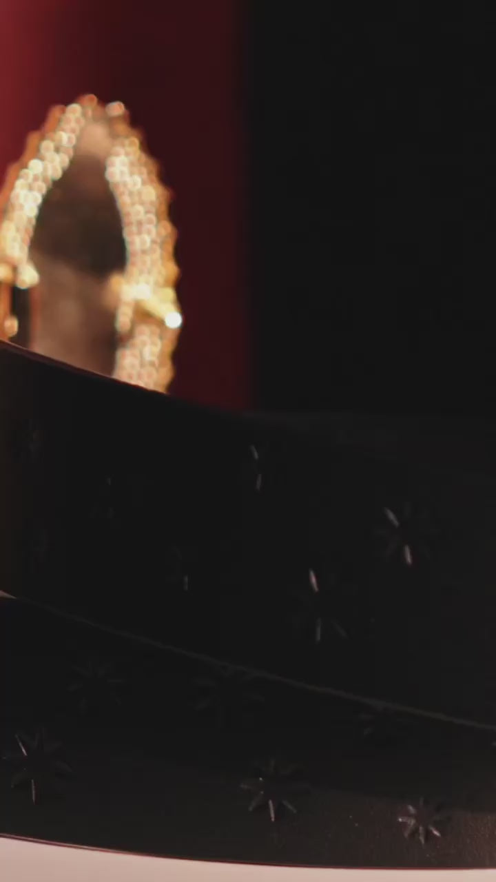 The gleaming, diamond-encrusted Virgin Mary centerpiece radiates and is perfectly anchored by the premium, detailed black leather belt.