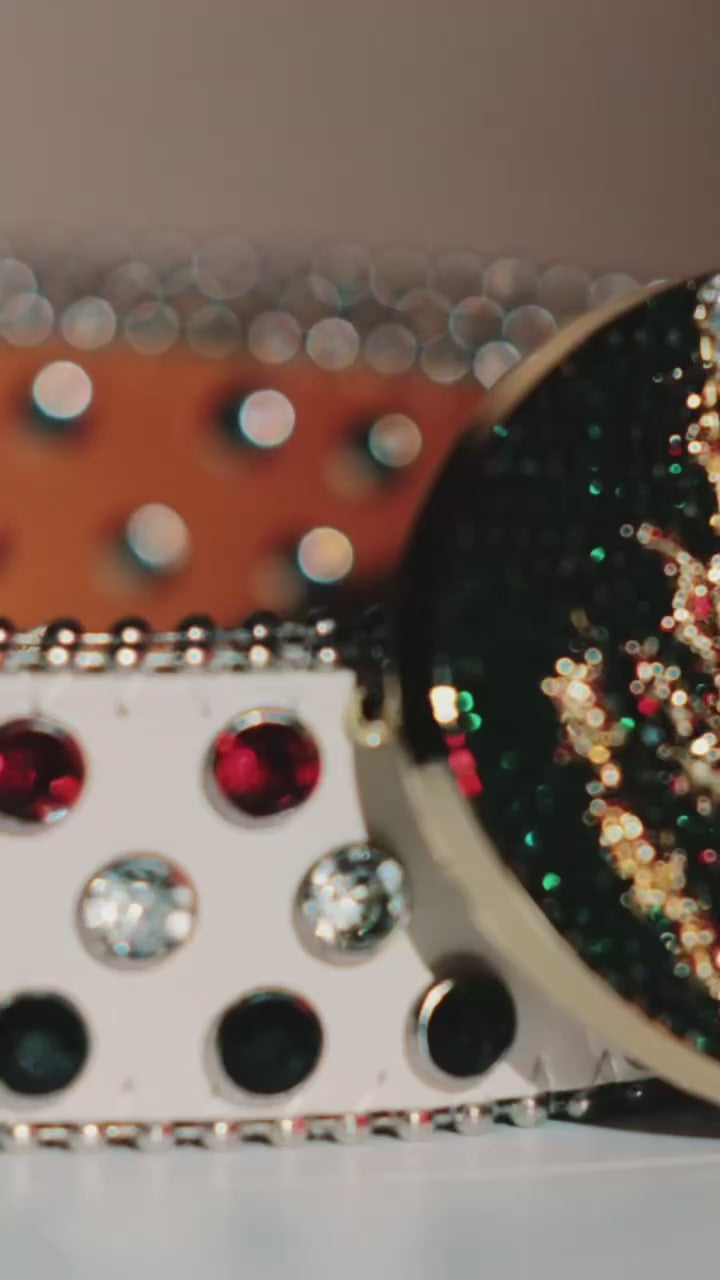 Luxurious crystals in red, white, and green brilliantly detail the Mexican Coat of Arms buckle. This studded white leather belt is the ultimate statement of heritage and luxury.